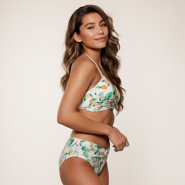Tropical Botanic- Strahle in diesem Top mit tropischem Print und einem Hauch von Gold. Dieses vorgeformte Neckholder-Bikinioberteil hat einen zarten goldenen Lurexfaden, der deinen Bikini besonders schick macht. Der Holzring zwischen den Cups sorgt für einen verspielten Effekt. Die langen Seitenstege sorgen für extra Halt.